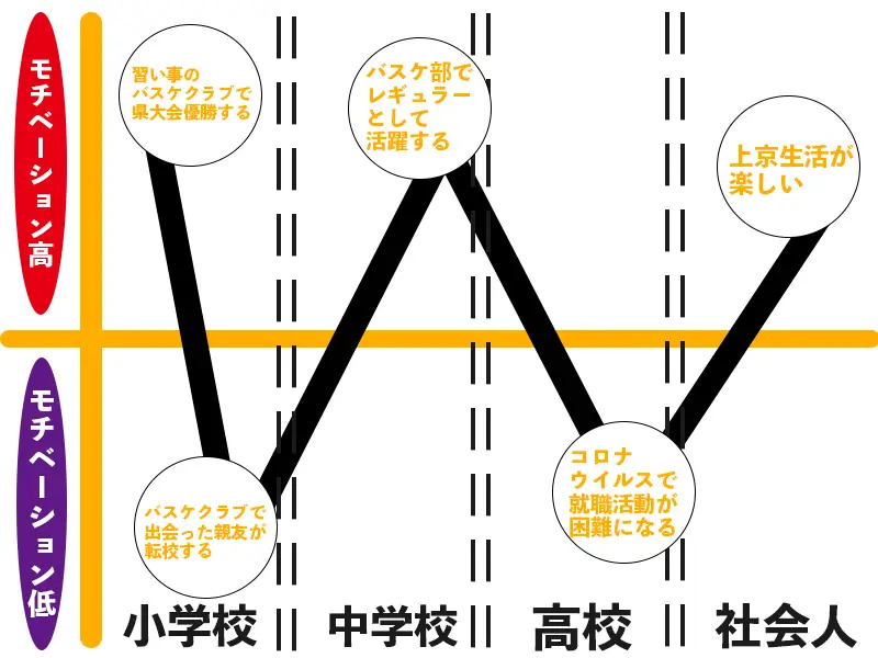 下記のように、小学校~現在までの出来事をモチベーショングラフでまとめておくことをおすすめします。